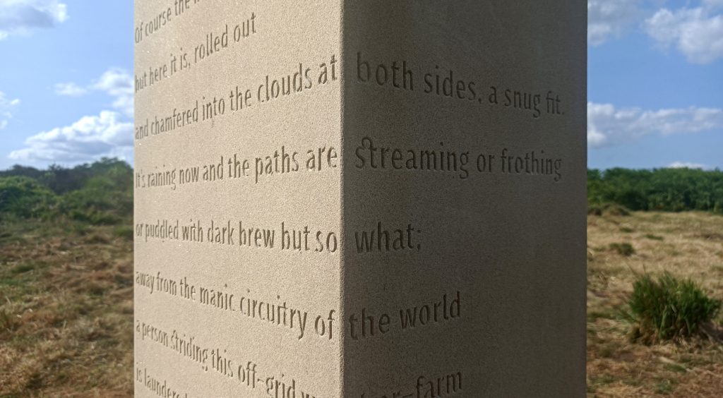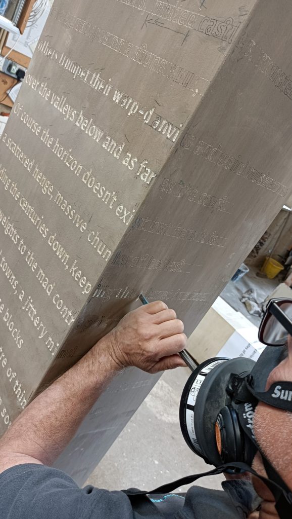collaboration with the poet laureate, simon armitage, at national trust brimham rocks, north yorkshire. letter carving by richard dawson. the installation is positioned where the rocks meet the moors – the subject of simon’s poem. the two columns are the same dimensions as farm gate posts from nearby, the text wraps around the stone prompting the reader to step through from one landscape to the other.test cut with at the national trust’s stone masons team at studley royal. the typography consciously avoids heritage cliches by blending contemporary type design and layout with traditional attention to detail.